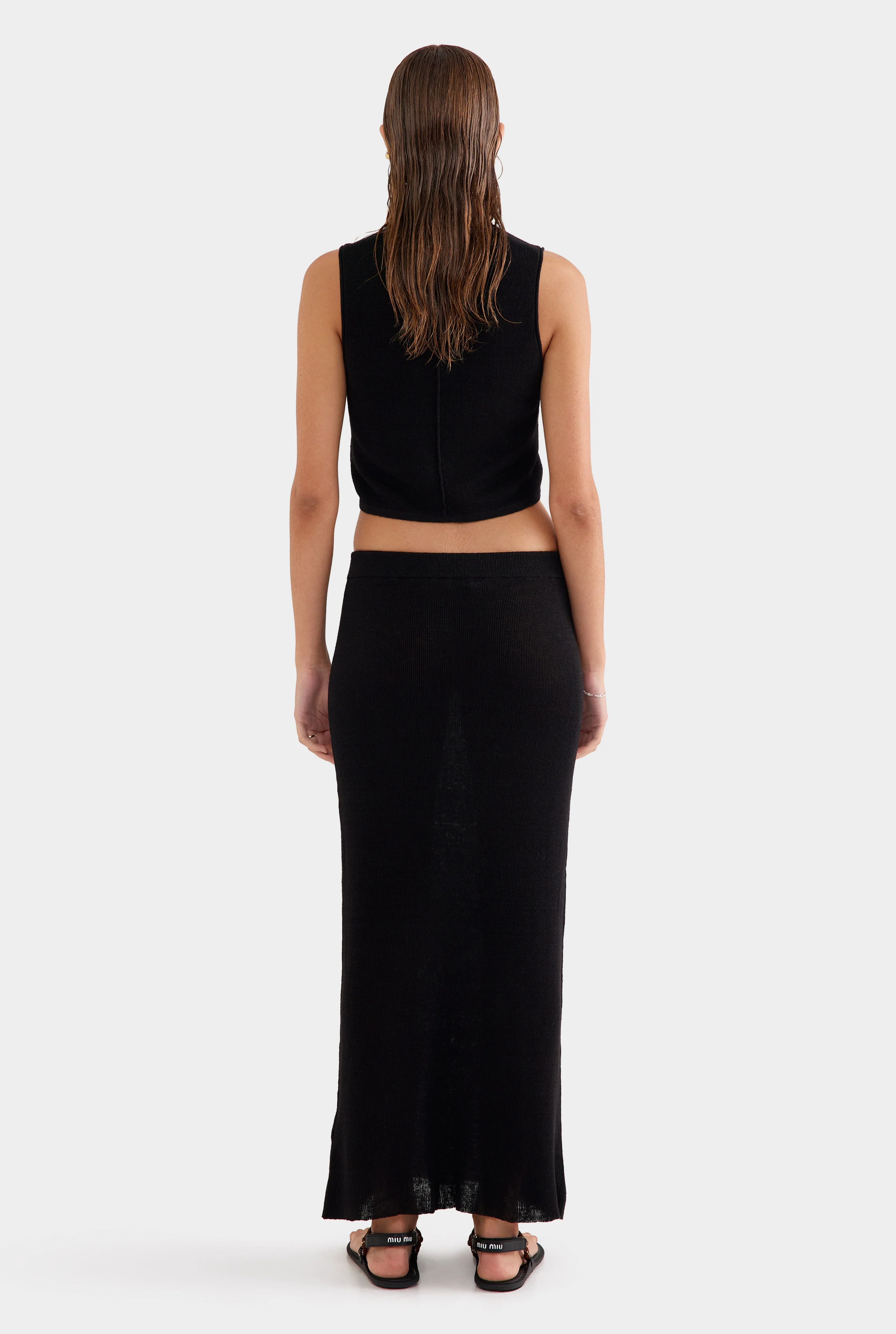The Rib Knitted Skirt in Black is a timeless essential that can take you from day to night. Knitted from linen for a drapey fit, it features an elasticated waistband and a slim silhouette. Complete the look with the matching crop tank, a sandal or heel.